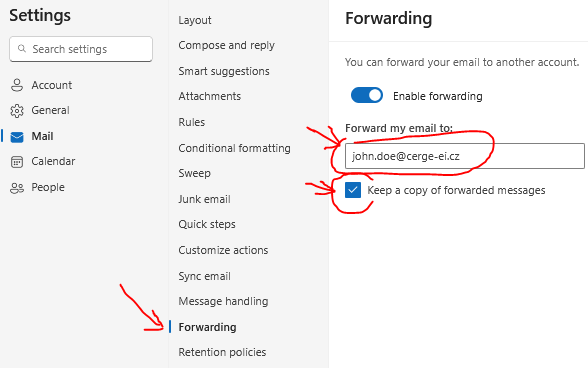 Email Forward settings for CUNI.CZ - via M365 cloud