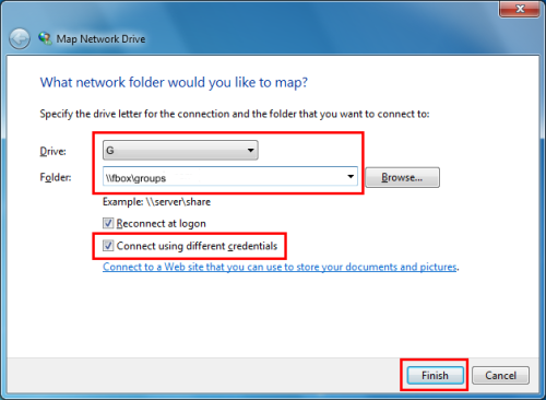 3. Use the drop down menus to assign a Drive letter (e.g. G) to the shared folder, e.g. \\fbox\Groups then click Finish.